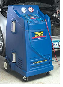 Ritchie Engineering has over 50 years experience building top quality a/c equipment for the HVAC industry. Their Yellow Jacket brand is well known for it's high quality and durability. Ritchie brings the same "commitment to quality" to their automotive line of a/c equipment. Ritchie Yellow Jacket now offers several top quality a/c machines for the automotive service professional. The Series 800, 830, and 870 a/c machines are a premium product which include such items as built-in flush for retrofit, "compressor driven power charge" for consistent charging at any temperature, a refrigerant management system for inventory control, large pneumatic tires, multi year warranty, and a built-in storage compartment, all as standard equipment. The new Series 810/820, semi automatic machines provide Ritchie quality at an economy price. If you don't require full automation, these machines are perfect for you. Don't settle for less, Ritchie Yellow Jacket is the best you can buy... |